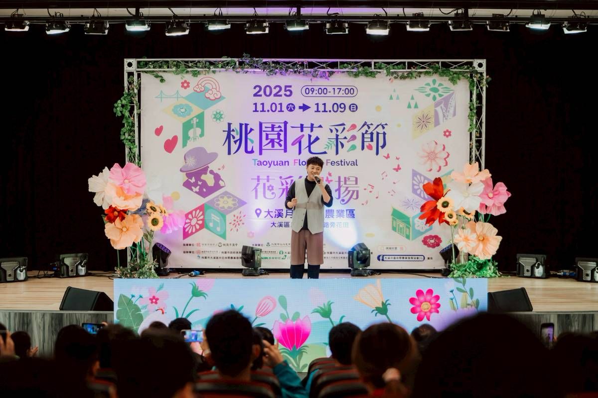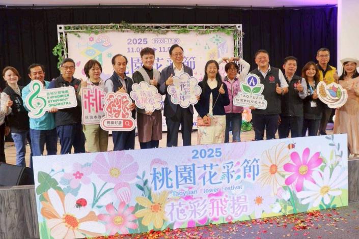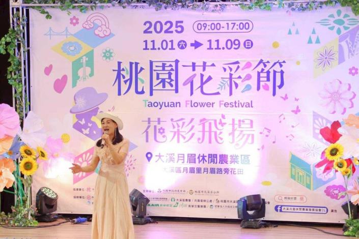 「2025桃園花彩節-花彩飛揚」11月1日起至11月9日將在桃園大溪月眉休閒農業區盛大登場,展區設置7座以「帽子歌后」鳳飛飛意象打造的裝置藝術,成為今年活動亮點。大溪是「帽子天后」鳳飛飛的故鄉,她的歌曲歷久彌新、經典傳唱,展區以「帽子」及「金曲」為設計元素,邀長榮交響樂團演出,讓市民在繽紛花海中欣賞動人樂章,體驗「花樂共融、花彩飛揚」的浪漫氛圍。金曲歌王許富凱今(29)日於記者會獻唱經典鳳飛飛組曲,並與桃園市長張善政一同為花彩節揭開序幕。
